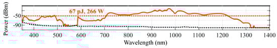 SC spectra in LNO waveguide pumped by 950 nm laser. The orange dashed line represents the 30 db bandwidth of each generated signal, and the black dashed line indicates the noise threshold of the spectrum analyzer [76]. Reprinted with permission from [76].