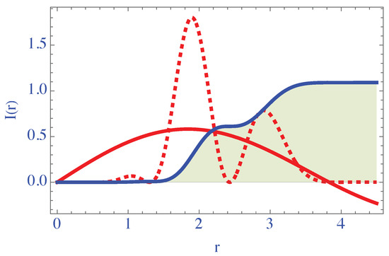 Representation of the radial integral , for , with in red, in dashed red. We have used and .