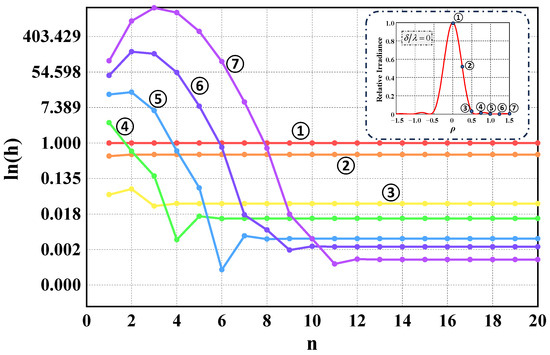 In evaluating the convergence speed of the series equation, Equation (19), for a system with typical parameter values, seven sampling values on the PSF curve are taken into account, as depicted in Figure 3. The abscissa represents the truncation term number N. All terms from n = 0 to n = N are retained and are included in the summation, while terms with n > N are omitted. The ordinate represents the corresponding values of the PSF curves with labels. The various curves in the graph represent the convergence status of the functions at the corresponding positions in the small graph. Evidently, all the curves converge rapidly and approach constants when N > 12, indicating that the confluent hypergeometric function series converges smoothly and quickly.