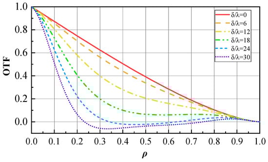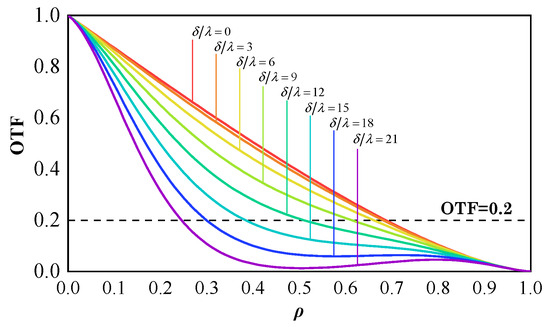 where is the Bessel function of the first kind of the order n. Each subfigure in Figure 2 corresponds to an OTF curve in Figure 4. The OTF gradually decreases at each frequency as the degree of defocus increases.