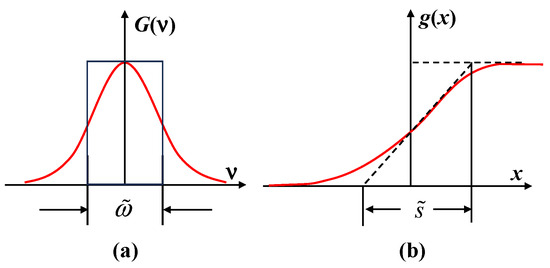 Equation (22) has a clear geometric meaning: if the height of a rectangle is equal to G(0) and the area is the same as the area under the curve G(ν), its width is called “equivalent bandwidth”; see Figure 5a. The reciprocal of the slope of the object image’s light intensity curve at the object’s edge is called the “equivalent line width”; see Figure 5b. The equivalent bandwidth and equivalent linewidth can be expressed as follows: