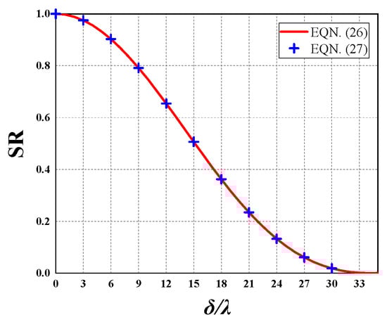 The Strehl ratio (SR) is a measure of the relative peak intensity of an optical system’s PSF, compared to that of an ideal, aberration-free system. In Equation (19), the SR can be calculated by setting , which requires considering only the term in the following equation: