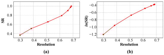 Figure 9a shows the curve of spatial resolution as a function of the SR. The abscissa of each discrete point represents the intersection point between the curve of different defocus states (see Figure 8) and the line OTF = 0.2, which is the resolution. The ordinate is the SR value at the corresponding defocus position. The ordinate in Figure 9b is the logarithm of the SR; the results show that the resolution is more closely linearly related to ln(SR).