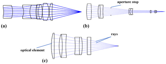 The 2D system layout of the three systems used for comparison is illustrated in Figure 10. Light rays from the left side of the system converge on the image plane on the right side.