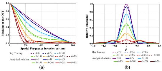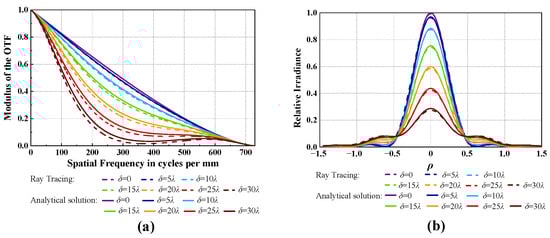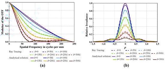 We compared the results obtained by the Zemax software’s ray tracing with the PSF and MTF calculated by the analytical solution. The defocused MTF and PSF curves of the three systems are shown in Figure 11, Figure 12 and Figure 13, respectively, where the solid line represents the result calculated by the analytical solution and the dashed line represents the result obtained by ray tracing. Table 4 presents the root mean square error (RMSE) values calculated between the MTF and PSF, obtained through two different methods at different defocus levels.
