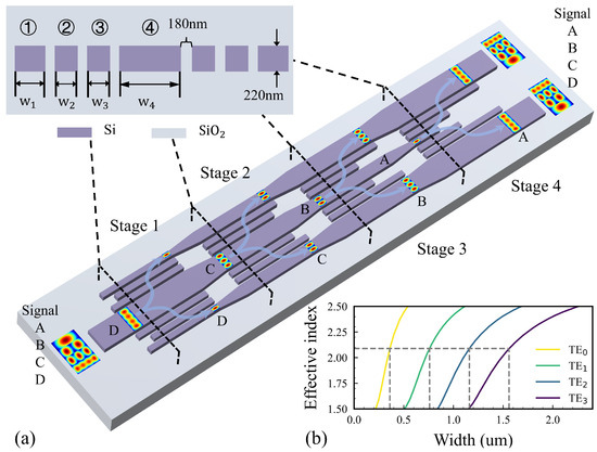 Each stage of the MDSCs, as illustrated in Figure 1a, is symmetrical and consists of seven parallel straight waveguides, sequentially numbered as waveguides 1 to 4. The gap between the waveguides is all 180 nm. Figure 1b shows the variation in the effective refractive index versus the waveguide width for the four modes. The widths of waveguides 4 and 1 on both sides of the MDSC should be chosen to match the corresponding input target mode and the output target mode, and the widths of waveguides 2 and 3 between them correspond to the fundamental mode. In this paper, we take the matched waveguide widths corresponding to the four modes to be 0.36 μm, 0.76 μm, 1.16 μm, and 1.56 μm. Such widths satisfy that the effective refractive index of the highest-order modes that each waveguide supports are matched. In this way, the target input and output modes are coupled within the MDSC and the coupling effect of the low-order modes is weak [18]. To suppress the crosstalk generated by the coupling between the tapers used to connect the MDSCs, it is necessary to maintain a sufficient distance between the waveguides 1 and 4 connected to the tapers, and that will make the distance between the tapers sufficiently large. Additionally, to maintain the coupling of the target modes, waveguides 2 and 3 should be introduced between waveguides 1 and 4. The eigenmodes within the MDSC, which can be calculated with an EME solver (Ansys Lumerical), are a series of supermodes with different distributions.
