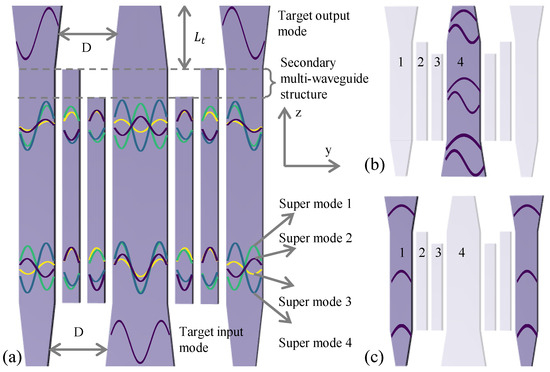 In the case where the input mode is the target mode , a series of supermodes are excited as shown in Figure 2a. Subsequently, because the propagation constants of the supermodes are different, the phase difference accumulated by each supermode will differ after a certain propagation distance. Ideally, the phase differences satisfy the condition, as shown in Figure 2a, so that the phase change of supermodes 1 and 2 is and that of supermodes 3 and 4 is , where n is a positive integer. The supermodes are linearly superimposed, resulting in two s being output at the end of waveguide 1.