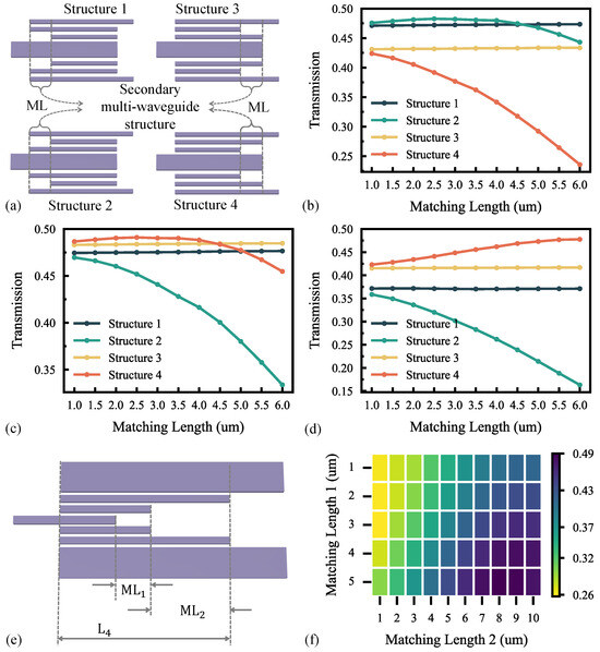 Considering that there can be many designs of SMWSs with different impacts on efficiency, we will only explore five optimized structures here for structural simplicity. Four of these SMWSs are constructed and their lengths are defined as the matching length (ML), as illustrated in the optimized schematic in Figure 3a. For a given ML, the optimum efficiency is obtained by scanning the entire length of the structure. On this basis, the variation curve of the transmission efficiency can be obtained by changing the ML, as shown in Figure 3b–d. Based on the results, stage 1 was selected to be optimized as structure 1, and stages 2 and 3 were optimized as structure 4. However, the phase difference of the supermodes within the fourth stage is so large from the ideal case that it is difficult to achieve efficient transmission efficiency with the above four structures. Here, we introduce two segments of the SMWS as shown in Figure 3e. By scanning the two MLs, the transmission efficiency of the fourth stage is obtained as shown in Figure 3f.