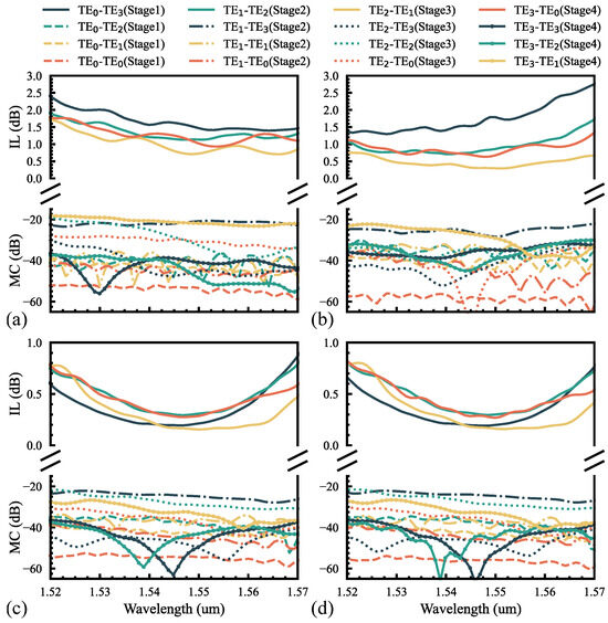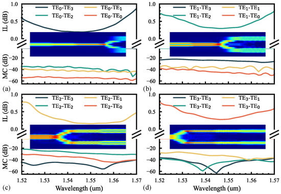 The simulated insertion loss and crosstalk with the wavelength and light propagation at 1550 nm in the MH-MPS when the inputs are the (a), (b), (c), and (d) modes.