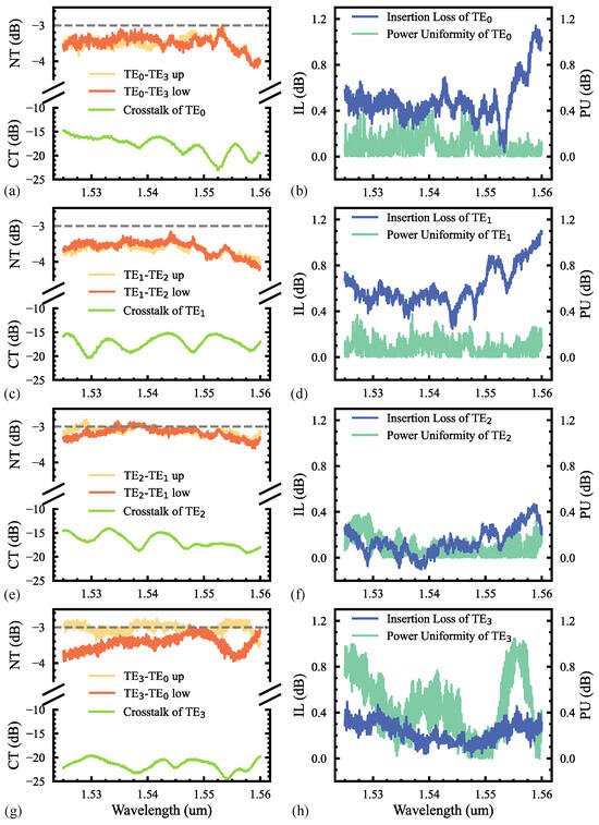 The normalized transmission (NT) of the upper and lower ports, crosstalk (CT), insertion loss (IL), and power uniformity (PU) with the wavelength when the input modes are (a,b), (c,d), (e,f), and (g,h).