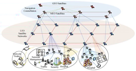 However, in low earth orbit (LEO) satellite networks, inter-satellite links are difficult to maintain due to the drastic changes in relative motion speed between satellites, and links are constantly established and interrupted [13,14,15]. Meanwhile, when affected by interference or space environment factors, such as by solar flares and atmospheric gravity wave disturbances [16,17], the ionosphere will be perturbed, which may lead to distortions and the mis-coding of the signals received by the receivers, which cannot be decoded [18]. These can lead to the network topology being time-varying. In addition, time transfer cannot be accomplished when the time synchronization source fails or the time transmission link fails. Therefore, it is necessary to quickly reselect the clock source and calculate the time synchronization transmission path according to the current network topology in order to achieve the continuous and stable transmission of real-time services.