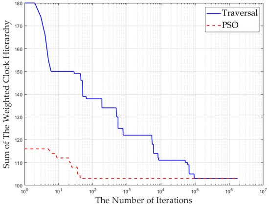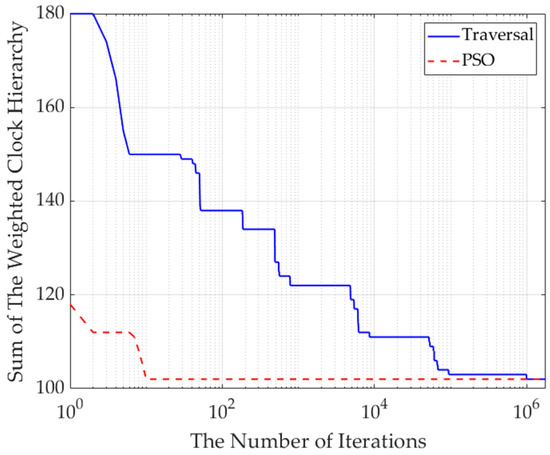 The curves of the number of iterations of the PSO algorithm and the traversal algorithm with respect to the sum of the minimum weighted clock levels are shown in Figure 3. Using the time monitoring program, the time for 10 iterations of the PSO algorithm is 0.043 s and for 116 iterations of the traversal algorithm is 195.63 s, respectively.