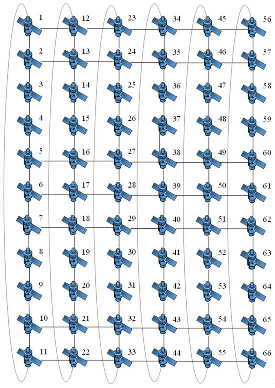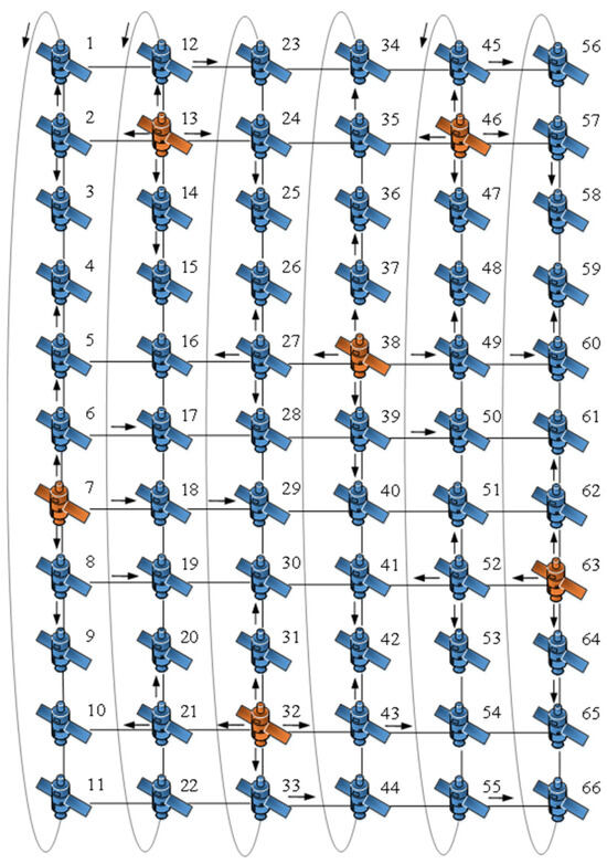 In order to study the time synchronization effect of the method in the case of network topology changes, we obtained another time slice of the constellation in one operation cycle by simulation, and the constructed network topology is shown in Figure 5. In the network topology, the numbers represent the satellites’ numbers. The difference with the network topology in Figure 4 is that there is no connection between the satellites in row 8 in Figure 5, i.e., there is no inter-satellite link between the satellites in neighboring orbits. The optimal clock source combinations are calculated for the network topology shown in Figure 5 using the traversal algorithm shown in Algorithm A1, and Table 4 lists the optimal clock source combination serial numbers and the corresponding clock source satellite numbers.