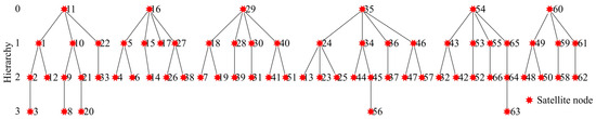 For the traversal algorithm and the proposed method, the clock transfer trees are constructed in the same way. We use 1–66 as the number for 66 satellites, with the first orbital plane numbered 1–11, the second orbital plane numbered 12–22, and so on. The time transfer trees are established based on their own time source satellites as root nodes with the clock layers of 0 [23].