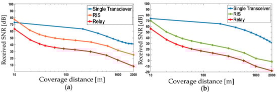 Figure 4a,b illustrate the received SNR versus the coverage distance along the track for a single transceiver FSO, RIS, and relay-assisted FSO communication systems in the presence of LN and GG channels, respectively. As shown, the single transceiver model demonstrates a superior coverage distance for both LN and GG channels, as it achieves a high received SNR at each BS compared to RIS- and relay-assisted FSO.