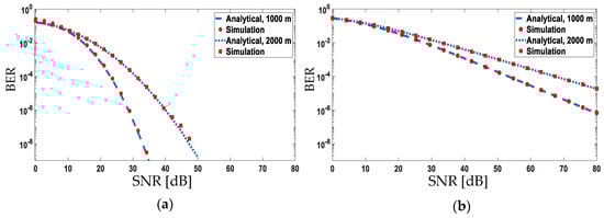 The BER performance of the dual transceiver model for NRZ-OOK with LN and GG distributed channel models for different propagation distances are presented in Figure 5a,b, respectively. The BER values are determined using Equations (16) and (18) for weak-to-moderate and strong turbulence, respectively. The results indicate that achieving a satisfactory BER under large propagation distances and strong turbulence requires high power. It is clearly depicted that the BER for the considered channels shows an improvement with increased SNR. Whether the turbulence strength is weak-to-moderate or strong, the consistency between the results obtained from numerical simulations and theoretical analysis is good. Monte Carlo computer simulations with iterations were used to obtain the simulated BER.