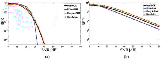 We evaluated the BER performance of our proposed model using the commonly employed OOK modulation technique. Furthermore, in order to conduct a fair comparison with the models presented in [], which involve an intermediate node between the transmitter and receiver, we evaluated the BER performance using the 4-PAM modulation technique for these models to maintain similar throughput. In the case of OOK, each time slot represents one bit since our model is a direct FSO system. On the other hand, we employed 4-PAM modulation technique for RIS- and relay-assisted FSO systems, which involves an intermediate node, where two bits are transmitted over two time slots. Therefore, both modulation techniques maintain a similar throughput of one bit per one time slot [].