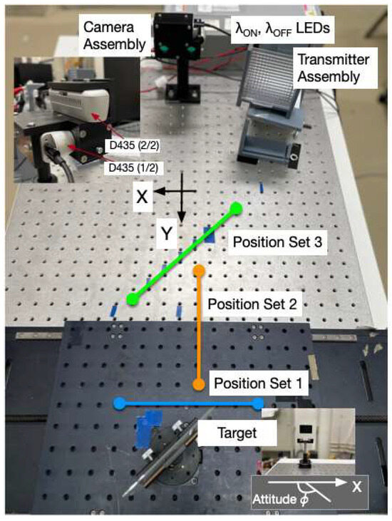 The optical bench used in the experiment has 23 (horizontal) × 31 (vertical) threaded holes arranged with a pitch of 25.4 mm. They are considered as lattice points in the 2D coordinate system , . In this paper, X and Y coordinates are represented using these coordinates. In the experiment, the target was placed at positions selected from Figure 1 and position sets 1, 2, and 3.