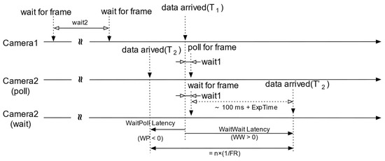 For camera 2, two options were considered for issuing commands. One option was using the ‘poll’ command, which enabled the obtaining of data from camera 2’s buffer along with its timestamp (T2) at T1+wait1. The other option was to use the ‘wait’ command to retrieve the subsequent data and timestamp (T’2) from camera 2’s data stream [19,20].
