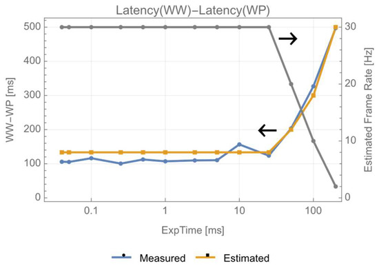 Using the measurement , taken by using the poll command for camera 2, and , by using the wait command, the camera’s internal frame rate (FR) for its exposure time (ExpTime) was estimated according to the model in Equation (6).