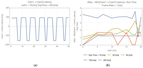 Camera 1 → camera 2 latency, (a) latency (wait1 = 18 (ms), exp time = 200 (ms)); (b) Max–min latency of 50 successive data, normalized by exp time.