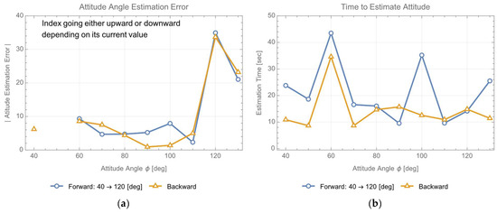 Like successive position estimation, it is feasible to estimate attitude angles in real time using the method described in Section 2. Figure 8 illustrates the outcomes of the attitude angle estimation, while fixing the target at (0, 27) and varying its attitude from 40 to 120 degrees. To estimate the attitude using the integrity measure, it is necessary to search for the minimum exposure time at which it converges. During the experiment, the current minimum value was searched around the previous value while varying the attitude angles.