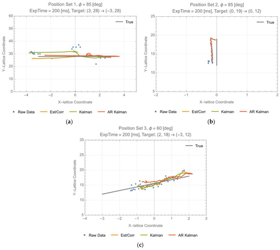 The above three processes are applied to the X coordinate and the Y coordinate estimations. The specified thresholds for each are and . Before tracking, the initial data for the AR model and the low-pass filter are needed. The median of 50 consecutive position determinations for the stationary target was used for this purpose, and it was then duplicated as necessary (four times for the AR model and eight times for the low-pass filter). This algorithm requires acquiring data before its operation and to optimize both and beforehand.
