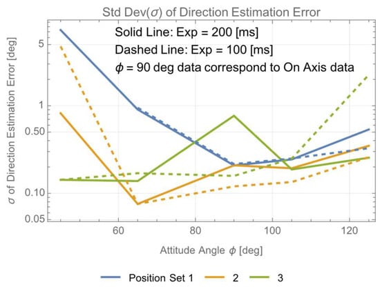 Assuming and are quantities of the same order, and assuming the same for and , the evaluation of is approximated as . By re-evaluating the accuracy of the direction angle estimation from the data included in a former paper [13], Figure 10 is obtained. The actual experimental data included a constant offset that varied from day to day, and this constant offset is due to errors in the daily setup of the experimental apparatus. In Figure 10, the accuracy of the direction angle estimation is evaluated by the standard deviation across each position set, excluding this offset.