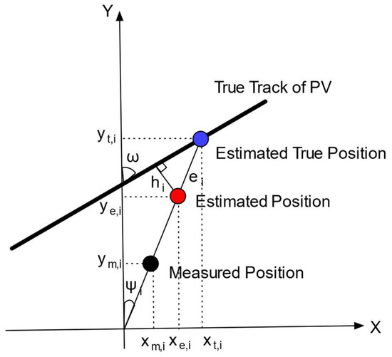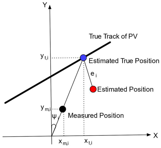 For position set 2, while the improved method in Section 5.1 is applicable, evaluating the score using the method described in Section 4.2.1 to estimate the true value is not feasible. As an alternative, a possible method is to evaluate the target’s position error by measuring the distance between the estimated position and the true track instead of the true position. This method is referred to as distance-based score in this paper. This corresponds to using instead of in Figure 14, and, in other words, evaluating the score based solely on the cross-track error, ignoring the along-track error. From Figure 14, the following Equation (17) holds: