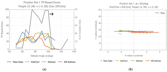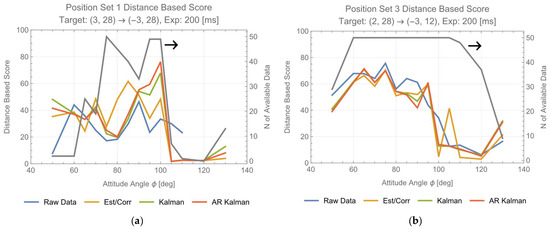 For position set 1, where = 90 deg and < 5.7 (deg) (=0.1 (rad)), , and TP-based score and distance-based score are nearly identical. For position set 3, , and distance-based score tends to overestimate. The track for position set 2 does not allow the application of Equation (17).