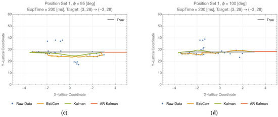 Assuming no external force on the target, the steady state Kalman filter [24] is used to estimate the position and the velocity of the n-th data point. Let measurement , and the raw data for be given by . The prediction for the n-th data using the data up to (n − 1)-th estimation is denoted as , and the estimation for the n-th data using the data up to n-th measurement and the n-th prediction is denoted as . The corresponding state equation is given by Equation (8a), Equation (8b), Equation (8c), and the observation equation is by Equation (9a) and Equation (9b).