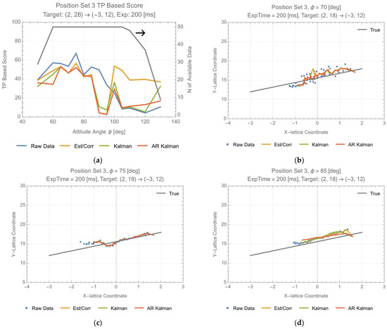 Assessment of distance-based score for position set 2 with another data set, exp time = 200 (ms), (a) distance-based score; (b) data of ϕ = 75 (deg); (c) ϕ = 90 (deg); (d) ϕ = 95 (deg).