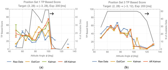 The results of the TP-based score are displayed in Figure 12 (position set 1) and Figure 13 (position set 3). Along with the score evaluation results, the right vertical axis is showcased by the N (number) of available data which meet the integrity measure. Based on the plot, it appears that the values on the horizontal axis corresponding with the maximum values (=50) on the right vertical axis are near the normal direction, and that the scores seem to increase there. In Figure 12, position set 1 shows many outliers and missing data, suggesting that the correction by the algorithm is effective. However, since position set 3 data contain fewer outliers and missing data, the algorithm correction is limited in comparison with the raw data. Although the evaluation results of the three algorithms do not differ significantly, it seems that the estimator/corrector, which requires costs for additional training, behaves slightly superior to (the uniform motion/) Kalman filter and AR (model/) Kalman filter.