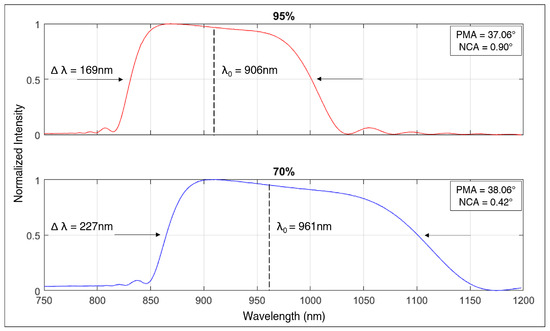 Simulated bandwidth , central wavelength , phase matching angle (PMA), and non-collinear angle (NCA) based on DKDP deuteration levels of 95% and 70%, using the Sellmeier equations for DKDP [41].
