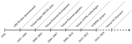 A timeline of the key milestones of OPCPA regarding the Vulcan laser development.