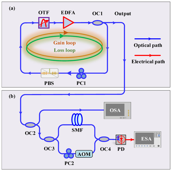 Figure 1 illustrates the schematic diagram of the experimental setup for the proposed polarization space PT symmetric fiber ring laser, along with the setup for evaluating performance of the laser output signal. As shown in Figure 1a, the fiber ring cavity comprises two polarization loops within a single fiber loop. An erbium-doped fiber amplifier (EDFA) provides gain. An optical tunable filter (OTF) serves for coarse wavelength selection. A 70:30 optical coupler (OC1) serves to close the loop and output port. A polarization controller (PC1) and a polarization beam splitter (PBS) are the key elements realizing the polarization space PT symmetry. Here, the function of PBS is equivalent to that of a polarizer [23]. The total cavity length is 97.5 m, corresponding to 2.05 MHz of the FSR. The experimental setup for evaluating the laser output signal performance is shown in Figure 1b. The output is divided into two paths by a 10:90 optical coupler (OC2), where 10% is coupled with a high-precision optical spectrum analyzer (OSA, Aragon Photonics BOSA lite+, 20 MHz resolution bandwidth) for spectral analysis, while the remaining 90% enters a delayed self-heterodyne system for longitudinal mode and frequency noise analysis. In the delayed self-heterodyne system, the signal is split into upper and lower arms by a 3 dB optical coupler (OC3). The upper arm is delayed by a single-mode fiber (SMF), while the lower arm comprises a polarization controller (PC2) and an acousto-optic modulator (AOM, G-1550-80) with an 80 MHz frequency shift. The signals from the two arms are coupled by another 3 dB optical coupler (OC4) and detected by a photodetector (PD, XPDV2120R, 50 GHz bandwidth), generating a beat signal for spectral and phase noise analyzed by an electrical spectrum analyzer (ESA, R&S FSW, 67 GHz bandwidth). Noteworthy is the fact that a 40 km SMF is used to analyze the longitudinal mode and spectral line shape of the laser, while a 9.77 m SMF is employed to measure the frequency noise spectral density and linewidth of the laser in the delayed self-heterodyne system.
