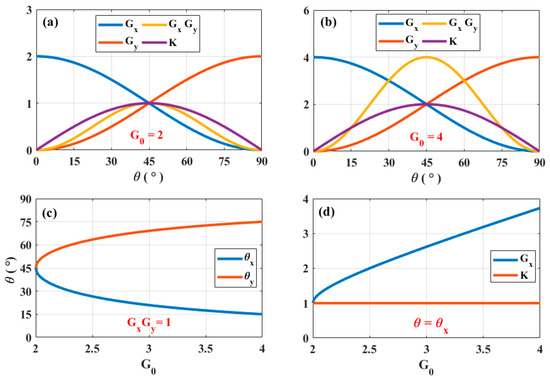 Figure 2 illustrates the interrelationship among the round-trip gain/loss, coupling coefficients, angle θ, and gain parameter G0. Figure 2a,b show the variations in the round-trip gain/loss for both loops, the coupling coefficient, and the GxGy coefficient as functions of θ, for G0 = 2 and G0 = 4, respectively. As evident from Figure 2a, when G0 = 2, the PT symmetric condition (GxGy = 1) is satisfied only when θ = 45° and the system lies at the exceptional point (EP) with K = Gx. An EP is a branch point singularity in parameter space where two or more eigenvalues and their corresponding eigenvectors of a non-Hermitian system coalesce and become degenerate [30,31]. In comparison, Figure 2b shows that, when G0 = 4, the PT symmetric condition is satisfied for θ = 15° or θ = 75°. However, in this case, K is smaller than Gx or Gy, resulting in PT symmetry breaking. Figure 2c illustrates the values of θ corresponding to different G0 values under the fulfillment of the PT symmetric condition. When the value of θ satisfies Equation (8), it can be observed that, for θ < 45°, Ex-mode exhibits gain in the round-trip performance. Under this case, θ is recorded as θx. On the other hand, for θ > 45°, Ex-mode displays loss, while Ey-mode exhibits gain in the round-trip performance. Under this case, θ is recorded as θy. Finally, Figure 2d shows the round-trip gain and coupling coefficients for different G0 values under the fulfillment of the PT symmetric condition. Evidently, when G0 > 2 and θ = θx, K is smaller than Gx, leading to PT symmetry breaking.