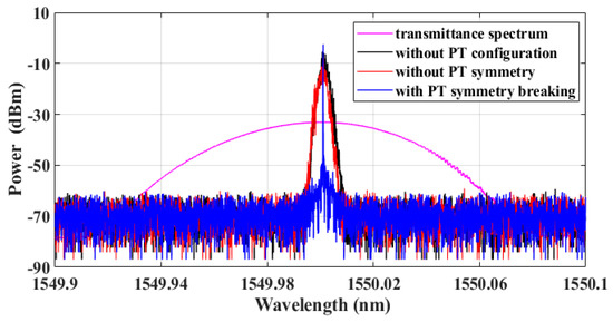 An experiment was conducted using the setup shown in Figure 1. Initially, the transmittance spectrum of the OTF was measured by the ‘Component Analyzer’ module of the OSA, as indicated by the magenta trace in Figure 3 with a 3 dB bandwidth of 0.0446 nm. Next, the optical spectrum of a fiber ring laser without PT configuration was obtained by removing the PBS and PC1 from the system shown in Figure 1a, as indicated by the black trace in Figure 3. Then, the main experiment was performed with the pumping current fixed at 150 mA in the setup shown in Figure 1a. When PC1 was adjusted without PT symmetry, the optical spectrum of the laser appeared as the red trace in Figure 3. However, when adjusting PC1 to achieve gain–loss balance, with the gain coefficient exceeding the coupling coefficient, PT symmetry breaking occurred, resulting in the solitary spectral line shown by the blue trace in Figure 3.
