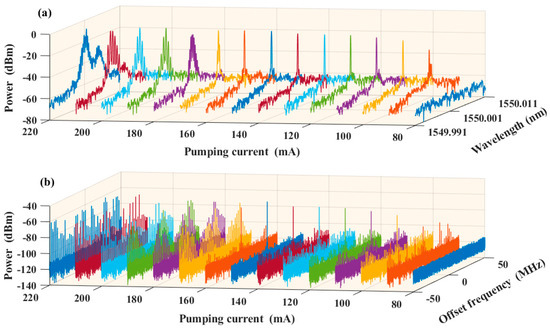 Given the 97.5 m length of the optical fiber ring cavity, the corresponding FSR was 2.051 MHz. However, the minimum resolution bandwidth (RBW) of the OSA was only 0.16 pm (20 MHz), which renders it challenging to definitively determine whether the output laser signal was single-longitudinal-mode. Hence, to assist in analyzing the oscillation modes of the laser signal, the output light was passed through an optical self-heterodyne system with a 40 km SMF length, followed by electric spectrum analysis of the beat signal obtained through the PD. The experimental setup shown in Figure 1b was utilized to observe the evolution of the output optical signal with variations in the EDFA pumping current (in 10 mA increments), while maintaining the state of PC1 fixed, as illustrated in Figure 4. Under different EDFA pumping currents, the spectral evolution of the output light is depicted in Figure 4a, with a span of 0.02 nm (25 GHz). Additionally, the spectral evolution of the beat signal is illustrated in Figure 4b, at a central frequency of 80.0 MHz, with a span of 100 MHz and an RBW of 10 kHz. As it can be seen from Figure 4 by observing the optical spectrum and electrical spectrum, under an EDFA pumping current of 80 mA, the output was noise. As the pumping current was increased to 90 mA, multiple peaks emerged in both spectra, suggesting a multimode output since the condition of PT symmetry breaking was unsatisfied. For the pumping current located at the range of 100~140 mA, only a peak with strong power was observed in the optical spectrum shown in Figure 4a, while some extra beating signals with weak power still appeared in the electrical spectrum shown in Figure 4b. With the increase in pump current, the extra beating signals gradually diminished, indicating that the system gradually approached the PT symmetry breaking state. Especially when the pumping current was increased to 150 mA, the side mode suppression ratio of the beat frequency signal attained its maximum of 55.2 dB. In this case, the PT symmetry breaking condition was well-satisfied, and the output exhibited single-mode behavior, corresponding to the principal mode. By further increasing the pump current to 220 mA, the condition of PT symmetry breaking deviated again, and the system presented the multimode output state. It should be pointed out that the results were obtained under fixed PC1. Our experimental results also show that, by adjusting PC1, the condition of PT symmetry breaking can also be well-satisfied under other pumping current conditions.