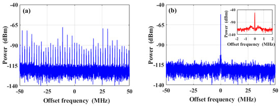 Figure 5 specifically shows the electrical spectrum of the beat signals detected under the conditions of a pumping current equal to 200 mA without PT symmetry, and under the conditions of a pumping current equal to 150 mA with PT symmetry breaking at a central frequency of 80.0 MHz. The resolution bandwidth (RBW) was 10 kHz and the span was 100 MHz. In Figure 5a, it is evident from the spectrum that there were multimode signals with a mode spacing of 2.051 MHz, corresponding to a cavity length of 97.5 m. By adjusting the pumping current of the EDFA to 150 mA to achieve PT symmetry breaking, a single-mode laser output was realized. In Figure 5b, it can be observed that all side modes were suppressed, indicating the successful attainment of a single-longitudinal-mode laser operation. The inset in Figure 5b shows a zoomed-in view with a span of 4 MHz. From the inset, it can be observed that there are two wing-shaped spectral peaks caused by the relaxation oscillation of the laser at the center frequency of the beat signal.