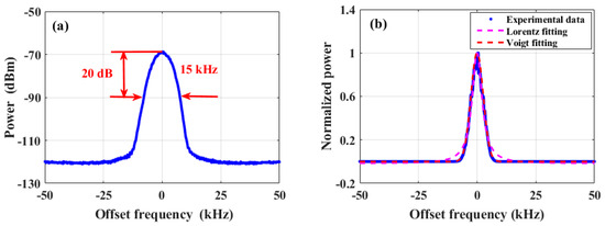 When this fiber ring laser output a single-longitudinal-mode optical signal under the PT symmetry breaking phase, the linewidth and line shape of the laser were analyzed by the conventional long-delayed self-heterodyne method with a 40 km SMF, as shown in Figure 6. Figure 6a depicts the electrical spectrum of the beat signal. The measured 20 dB linewidth was determined to be 15.0 kHz, corresponding to a 3 dB Lorentzian linewidth of 750 Hz. Notably, upon power normalization of the measured spectra and subsequent fitting with Lorentzian and Voigt functions, as illustrated in Figure 6b, the Voigt fitting appeared to better conform to the experimental data. This observation indicates that 1/f noise predominated in the output optical signal. However, this linewidth estimation method has certain limitations. Utilizing the long-delayed self-heterodyne method requires determining the coherent delay length based on the linewidth, and the delay time must be approximately six times the coherence time of the laser [32]. Yet, excessively long fiber delay lines introduce unnecessary 1/f noise, rendering the long-delayed self-heterodyne method challenging for linewidth estimation. Therefore, the noise of the laser was analyzed using the short-delayed self-heterodyne method.