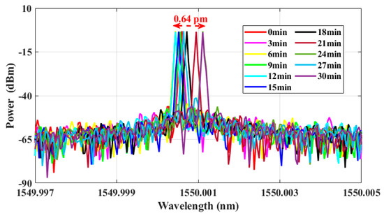 The long-term stability of the laser was monitored during a 30 min period. As depicted in Figure 8, the optical spectrum of the generated laser signal exhibited a wavelength drift throughout the 30 min interval. The wavelength drift arose from internal noise within the laser device and interference induced by external environmental factors. The wavelength drift range of the PT symmetric fiber ring laser was approximately 0.64 pm.