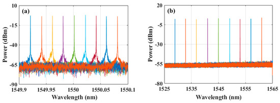 By adjusting the OTF, wavelength tunability of the single-mode laser could be achieved, as illustrated in Figure 9. Figure 9a shows the optical spectra of the laser when the wavelength was finely tuned with a step of 20 pm from 1549.92 nm to 1550.08 nm, and Figure 9b shows the optical spectra of the laser when the wavelength was coarsely tuned with a step of 4 nm from 1529 nm to 1561 nm by tuning the OTF. The spectral range displayed in Figure 9b spanned from 1525 nm to 1565 nm, a limitation imposed by the measurement range of the OSA. Without the constraints of the measuring range of the instrument, the tuning range of this laser would likely be broader. It can be observed from Figure 9 that the tuning range of this laser covered the entirety of the C-band. It demonstrates that the polarization space PT symmetric fiber ring laser can effectively realize a wide wavelength tuning range.