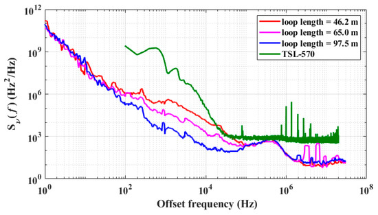 To investigate the influence of cavity length on the frequency noise of polarization space PT symmetric fiber ring lasers, the noise properties of single-mode optical signals generated by PT symmetry breaking in cavities with length of 46.2 m and 65.0 m were also examined, respectively. Figure 10 depicts the frequency noise spectral density of the PT fiber lasers with different cavity length and a high-performance tunable laser (TSL-570). The red spectrum line represents the frequency noise spectral density for a cavity length of 46.2 m. The magenta spectrum line corresponds to the frequency noise spectral density for a cavity length of 65.0 m. The blue spectrum line corresponds to the frequency noise spectral density for a cavity length of 97.5 m. The green spectrum line represents the frequency noise spectral density of the TSL-570. As it can be observed from Figure 10, within the offset frequency range of 102 Hz to 105 Hz, an increase in cavity length resulted in a notable suppression of the frequency noise of the output optical signal. Specifically, at an offset frequency of 10 kHz, the frequency noise spectral density was approximately 1.283 × 104 Hz2/Hz for a cavity length of 46.2 m, 1.657 × 103 Hz2/Hz for a cavity length of 65.0 m, and 181 Hz2/Hz for a cavity length of 97.5 m. Moreover, the frequency noise of the PT fiber lasers with the three different cavity length was lower than that of the TSL-570. In contrast, the PT symmetric fiber ring lasers demonstrated excellent low noise characteristics.
