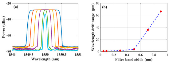 The roll-off characteristics of the OTF can affect the gain difference between the principal mode and the side modes. A larger gain difference leads to a reduced influence of the wavelength drift from internal noise fluctuations and environmental interference within the laser. Therefore, the wavelength drift of the PT symmetric fiber ring laser over a period of 30 min is demonstrated with the different bandwidth of the OTF in Figure 12. Figure 12a shows the transmittance spectra of the OTF with different bandwidth measured by the OSA. Figure 12b illustrates the corresponding relationship between the bandwidth of the OTF and the wavelength drift range of the PT symmetric fiber ring laser during a 30 min period. As it can be observed from Figure 12b, an increase in the bandwidth of the OTF resulted in a deterioration of the long-term stability of the laser. Particularly, the wavelength drift range began to increase significantly when the bandwidth exceeded 0.5015 nm. The reason why may be due to two factors. One is that the flat-top part in the transmittance spectrum of the OTF significantly expanded, enhancing the variation range of the potential maximum gain position. The other originates from the disturbance of internal noise and the external environment. Consequently, the drift range of the principal mode wavelength selected by the PT symmetry breaking mechanism was much larger than the longitudinal mode spacing. Therefore, the selection of an optical filter with a large roll-off is helpful to improve the stability of the PT symmetric fiber ring laser.
