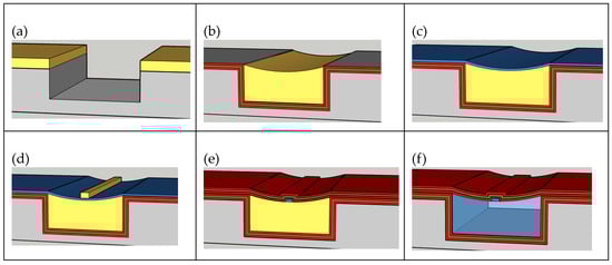 Our first design consideration involved the thin films meant to act as ARROW layer pairs. Besides being compatible with silicon microfabrication processes, our layers must have large differences in refractive indices and be optically transparent to the light meant to propagate down the waveguide. Previous work carried out by our group demonstrated ARROWs utilizing PECVD-grown silicon dioxide (refractive index ≅ 1.5) and silicon nitride (refractive index ≅ 2.0) [16]. Using this as a foundation, these materials were again chosen to prove our new design. The correct thickness, di, for each thin-film layer to create a Fabry–Perot reflector can be determined by Equation (1) [17].
