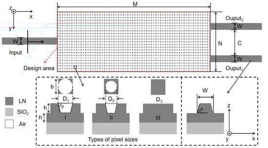 Figure 1 shows the schematic of the beam splitter structure. The design in based on a thin-film LN integrated platform. Its etching depth is nm. We took a rectangular region for the inverse design with a length of and a width of . The input and output waveguides have a width of , and the spacing of the two output waveguides is . The design area is partitioned into square pixels, with each possessing identical geometric dimensions. The individual pixel length is b = 200 nm, with the central circular region representing the etched hole. Considering the fabrication practice, the sidewalls of the waveguide, as well as the holes, have an angle of . In geometric structures with sharp edges or corners, electric or magnetic fields tend to concentrate at these points, thus creating singular fields [19]. To effectively mitigate the impact of these singular fields, dielectric caps [20] can be used to smooth the field distribution. Alternatively, employing smooth transition curves and rounded edges can help avoid sharp edges and corners. Additionally, gradient material techniques can be utilized to gradually change the dielectric constant or conductivity at material interfaces, thus smoothing the field distribution. In this work, due to manufacturing and design considerations, numerical techniques were employed to reduce the impact of singular fields. High-precision mesh refinement and appropriate boundary conditions were used to minimize numerical instability. The boundary conditions were set to a Perfectly Matched Layer (PML), and fixed-size locally refined meshes were applied within the design area to enhance the accuracy of the numerical simulations. At the sharp edges of the geometric structure, the mesh size was set to 20 nm to capture the rapid variations in the electromagnetic field. Compared to larger meshes in other regions, this local mesh refinement significantly smooths the field distribution, reduces field concentration, and effectively mitigates the numerical instability caused by singular fields, thereby improving the stability and accuracy of the simulation results.