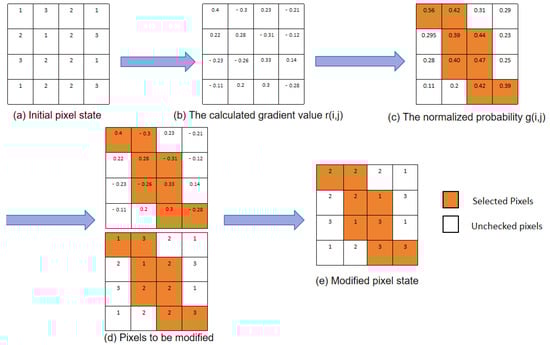 Step 4: Derive the normalized gradient probability for each pixel based on Equations (4) and (5). Compare the gradient probability of each pixel with a random number L, and select pixels where for modification. Figure 3c depicts the normalized gradient probability .