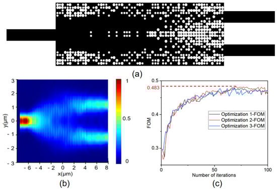 The results after optimization using the DBS algorithm: (a) Final structure. (b) Optical field distribution. (c) FOM evolution plot.