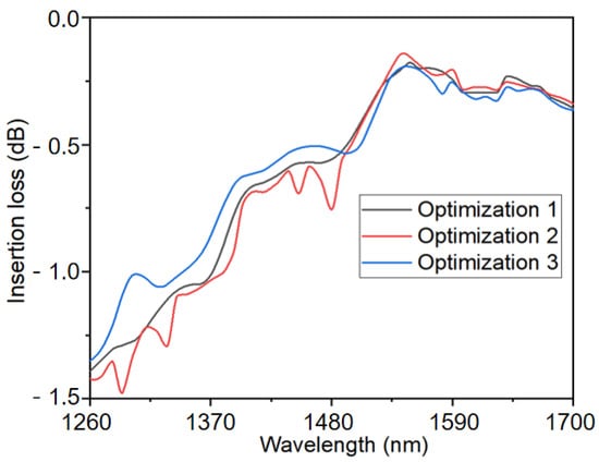 Figure 5 shows the changes in the insertion loss for three optimizations at different wavelengths. It is observed that within the wavelength range from 1260 nm to 1380 nm, the insertion loss exceeded 1 dB, while in the range from 1390 nm to 1490 nm, it surpassed 0.5 dB. Between 1500 nm and 1700 nm, the insertion loss remained below 0.5 dB, thus reaching its minimum value at 1550 nm. In the context of the three distinct initial structural optimizations, the corresponding minimum values of the insertion loss were 0.179 dB, 0.15 dB, and 0.192 dB.